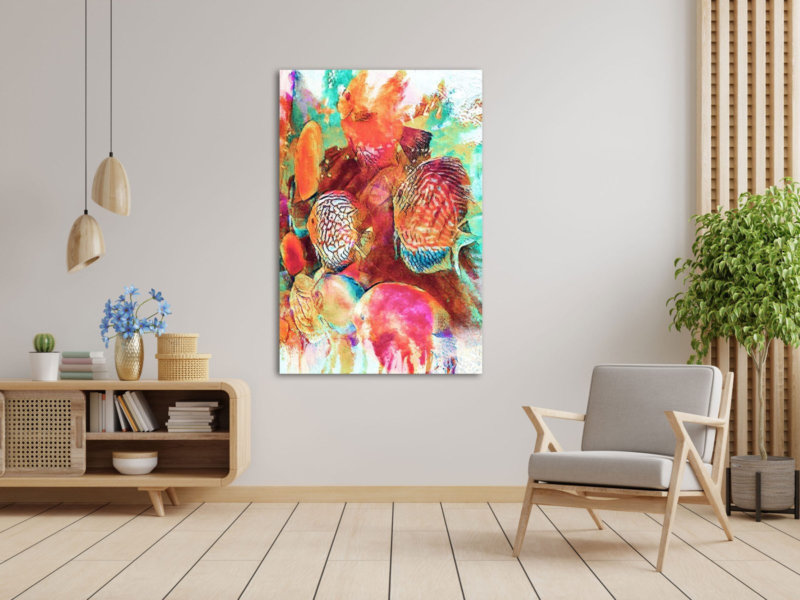 A burst of fiery shades and abstract forms mingle in a dance of color and texture. The flowing patterns and familiar shapes evoke a sense of underwater beauty, where coral-like designs ripple through waves of orange, red, and turquoise. This piece pulses with energy and rhythm inviting one to stand still and fathom its depths